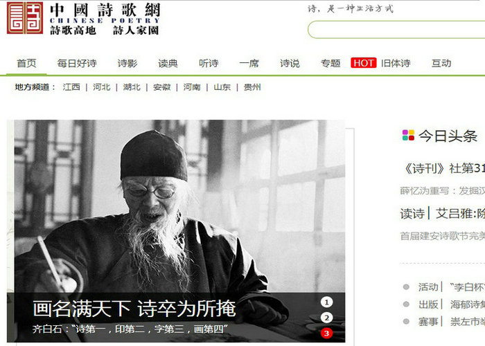 中国诗歌网(www.zgshige.com)由中国作家协会与中国作家出版集团主办,于2015年6月18日正式上线,是国家重点文化工程,依托中国作家协会、全国多家诗歌专业机构、全国百家诗人社团等资源,旨在建设一个推动与繁荣当代诗歌创作、促进写诗人与读诗人更好交流的全国性诗歌服务平台。网站分电脑端、手机端、客户端3个端口,电脑端拥有原创诗歌写作平台,网友可以在其中以诗会友,每天可以分享数以千计的诗歌新作;手机端将方便诗歌爱好者随时随地阅读、聆听、创作、发表作品;客户端于2015年6月30日正式开放下载,推送文字、音频、视频等多种类诗歌产品。
