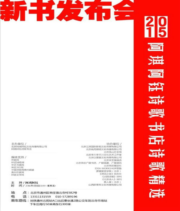 由北京阿琪阿钰文化传播有限公司、阿琪阿钰诗歌书店联合主办;北京江湖国际影视文化传媒有限公司、北京皓月朗明文化传播有限公司等多家单位联合协办的《2015年阿琪阿钰诗歌书店诗歌精选》新书发布会将于2016年1月1日下午13:00在北京市通州区宋庄镇北寺村382号举办。