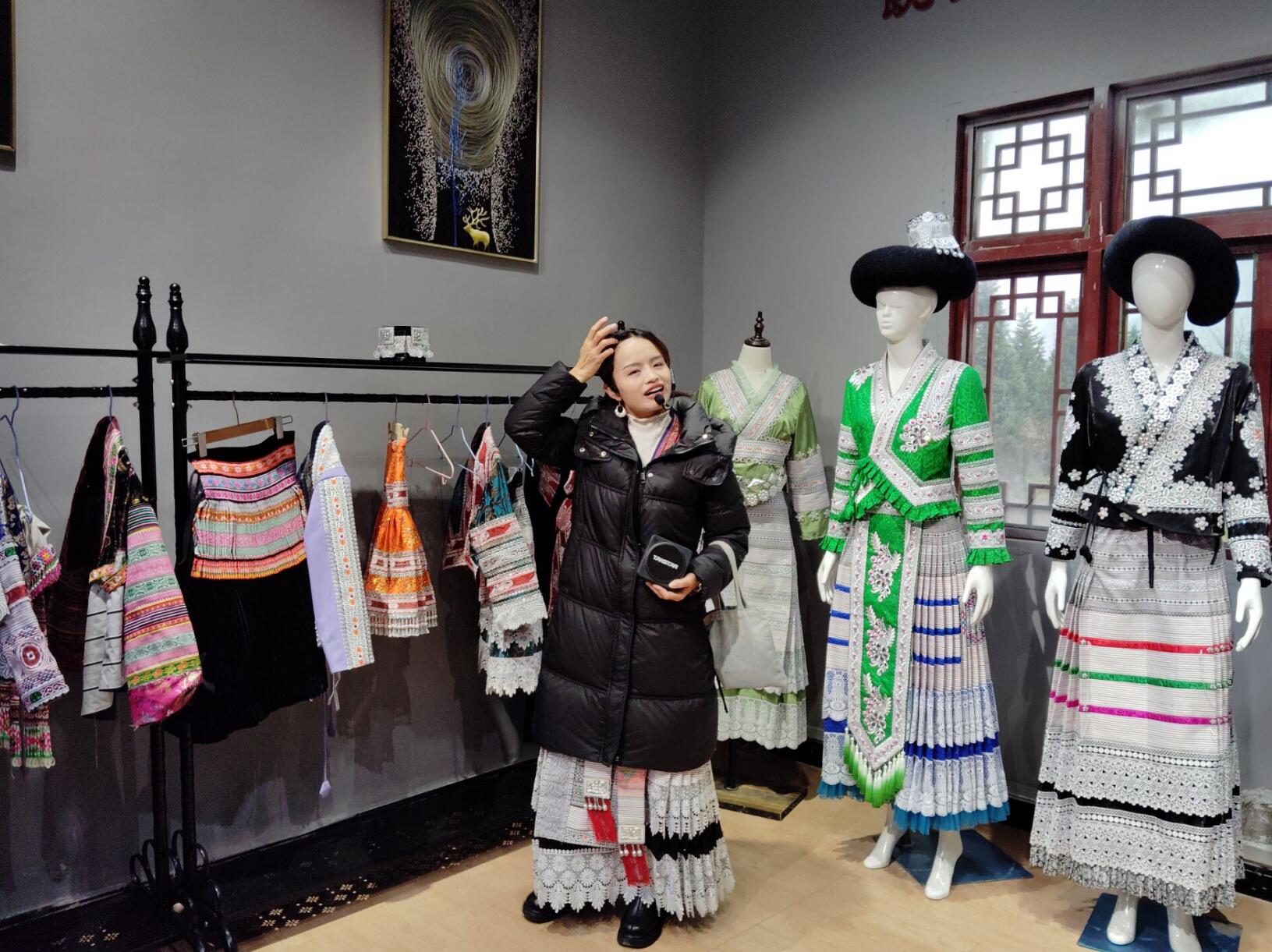 从赵玉学家出来,我们走进扶贫车间,了解特色苗绣产业,了解苗族文化传承。化屋村284户人家,有282户是苗族。这里的苗族称为弯角苗,自称蒙,有自己的民族语言和独特的民族文化,他们的服饰以白底配花为主,女装刺绣较多,配有蜡染,裙装特别漂亮。现在村里已经这些民族文化元素做成产业,不光是出产品,还可以让游客体验苗族工艺。在扶贫车间里,还通过电商直播,让这里的苗族文化产业走出大山,走向全国各地。