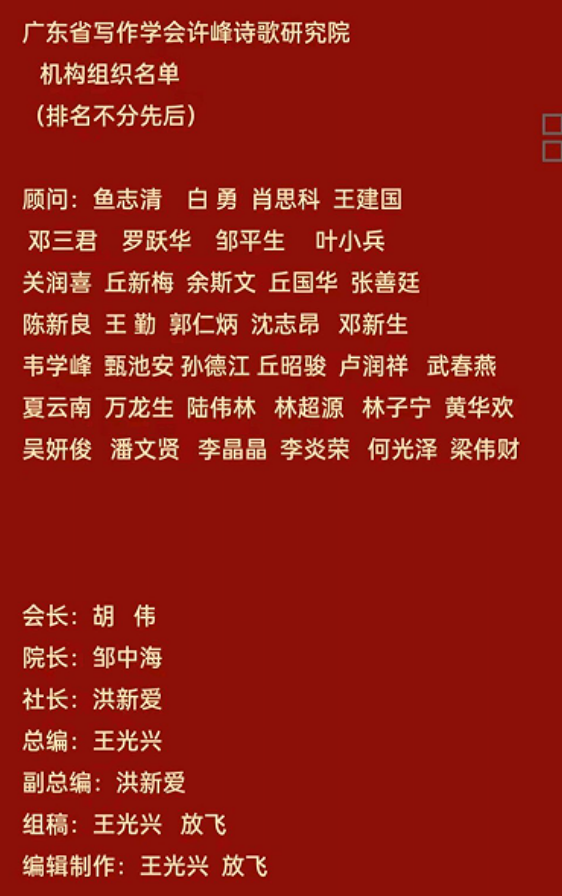 广东省写作学会许峰文学艺术研究院在会长胡伟和院长邹中海的正确领导下,始终坚持以许峰诗歌诗学为指导思想,奉行“行文意为先,崇古不固古”的核心理念,加持以海纳百川,百花齐放的开放性和包容性为导向,加持以人民为中心,加持守正创新,目前已经取得了辉煌灿烂的成绩。