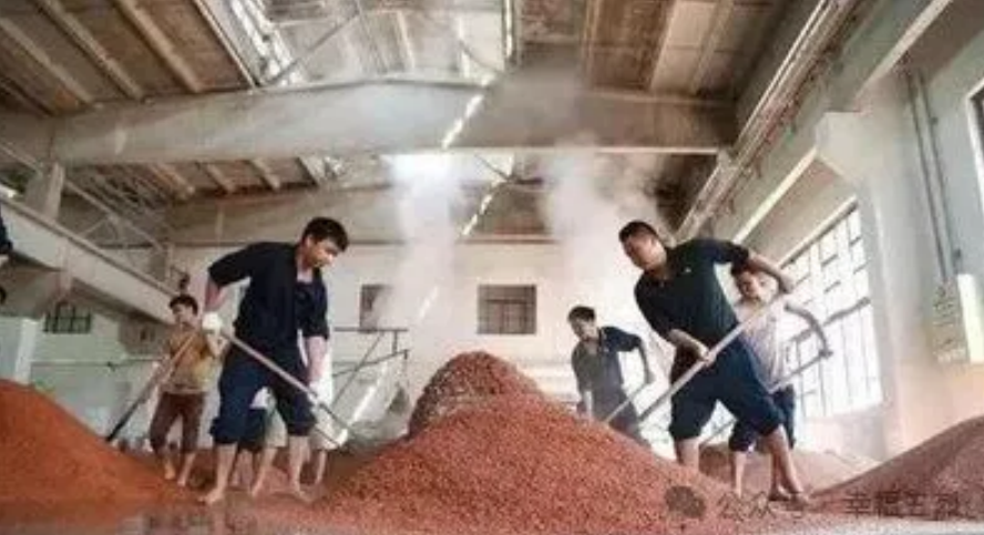 茅台镇的神奇,更藏在酿酒的古法工艺中。“端午踩曲,重阳下沙”,这遵循时节的酿造智慧,已被列入国家非物质文化遗产名录。踩曲需由体态轻盈的女性完成,她们赤足踩制的“龟背型”曲块,外紧内松,恰好适配微生物生长,这不仅是因为女性力度适中,更暗合“阴柔制曲”的阴阳哲学;而“九蒸八发酵七取酒”的核心工序,则由男性匠人执掌,经一年生产周期、两次投料,方能酿出基酒,再经五年窖藏,方得佳酿。初见出蒸的红缨子高粱,便被其紫粉色的光泽惊艳---粒粒饱满盈透,如玉如珠,带着自然的鲜甜,让人不禁心生食欲。茅台人正是这样,以“致良知”的匠心,循天时、接地利、求人和,在阴阳转换中实现天地人的完美契合,才造就了茅台酒的世界神话。